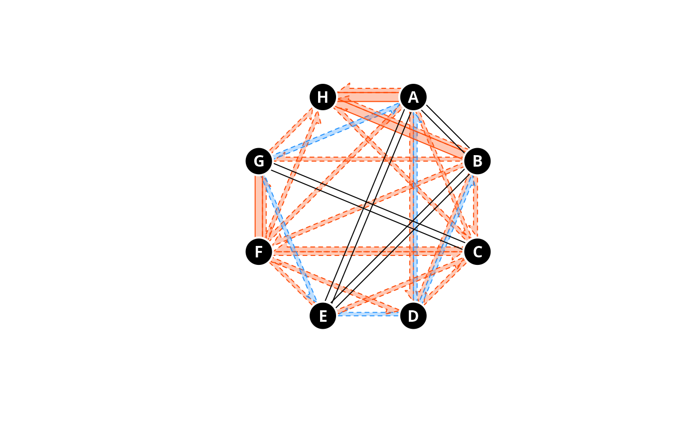In the plots, trajectories are represented by circles. The convergence or divergence between pairs of trajectories are represented by links. If convergence tests are symmetric, the links are simple. If the convergence tests are asymmetric, the links are displayed as half arrows pointing from the trajectory converging or diverging towards the trajectory being approached or diverged from.