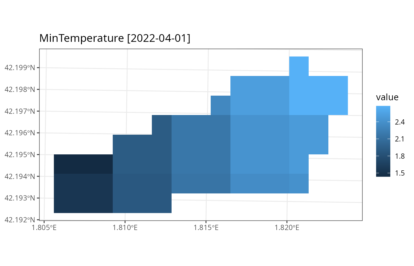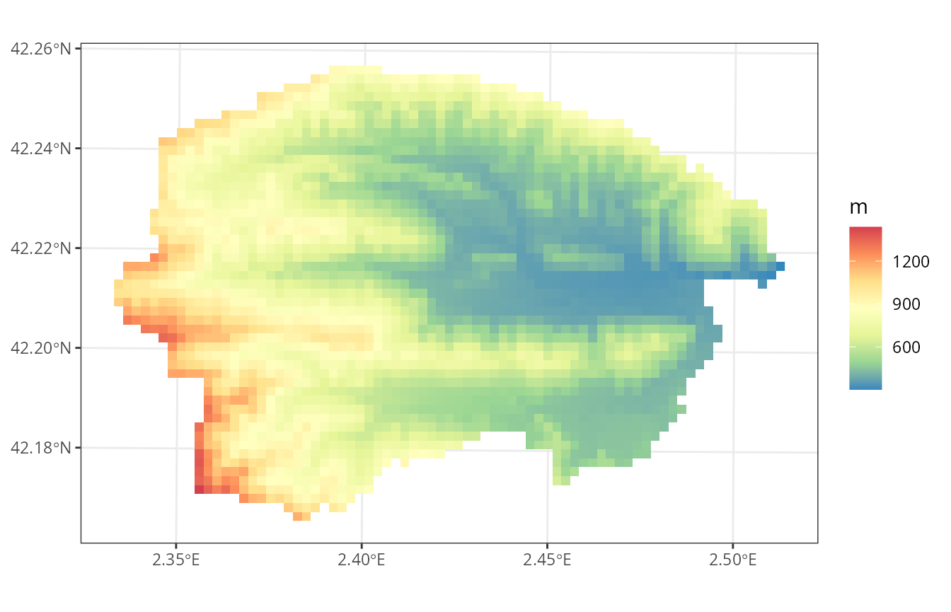 watershed_control = ws_control, progress = FALSE)Note that we did not define dates, which are taken from the interpolator data. If we plot the minimum temperature, we will appreciate the spatial variation in climate: